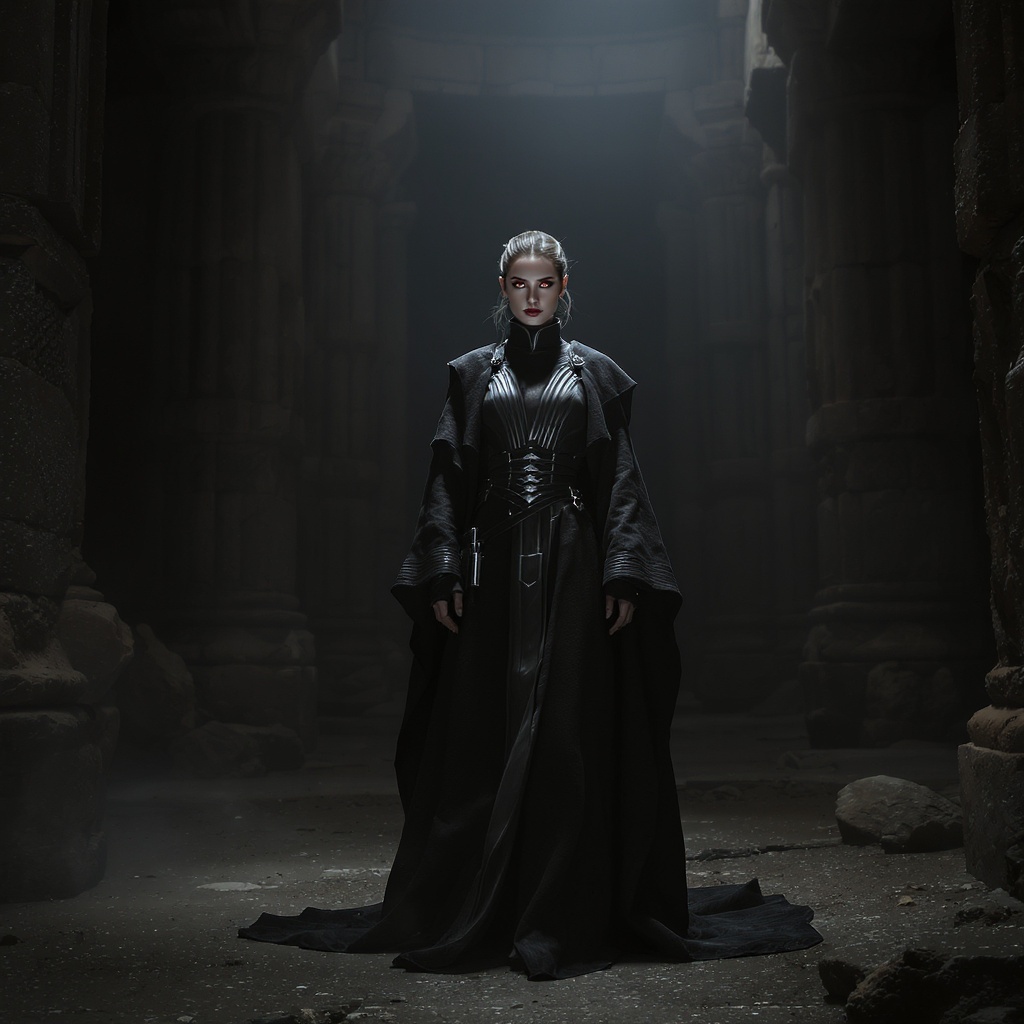 A solitary female figure stands in a dim, ancient Star Wars temple, shrouded in dark, flowing robes. Her symmetrical, piercing eyes gaze forward with an enigmatic intensity, capturing the viewer's attention. The scene is illuminated with dramatic lighting that enhances the hyperrealism of the setting, accentuating the intricate details of her attire and surroundings. The image showcases a full-body shot, captured with a sharp, high-definition focus that rivals professional photography, utilizing a wide-angle perspective to capture the grandeur and complexity of the location. The composition boasts stunning color grading and meticulous attention to detail, resembling a cinematic masterpiece with advanced techniques like ray tracing, volumetric lighting, and global illumination. Every element appears lifelike, from the subtle backlighting to the shimmering surfaces and soft, moody ambiance. The photograph showcases an unprecedented level of detail, with vibrant colors and deep contrasts, leveraging technologies like OpenGL Shaders and RTX for an immersive, ultra-realistic presentation. Through a balance of elegant design and dynamic posing, the scene pays homage to the iconic imagery of a Sith Lord in a cinematic context, with a profound sense of presence and depth.