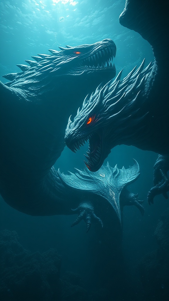 Twomassivescalemonsters engaging in an epic battle, exuding power, rage, and anger in the deep sea. Set deep underwater with a dramatic background, exhibiting occlusion and an epic wide shot from an aerial perspective. The scene is steeped in a dark fantasy atmosphere, blending the styles of League of Legends and Sea of Thieves. Created with CGI, the image boasts depth focus, enhanced by crepuscular rays, achieving a photorealistic and realistic appearance. It is detailed and hyperrealistic, with complex, intricate maximalist elements.