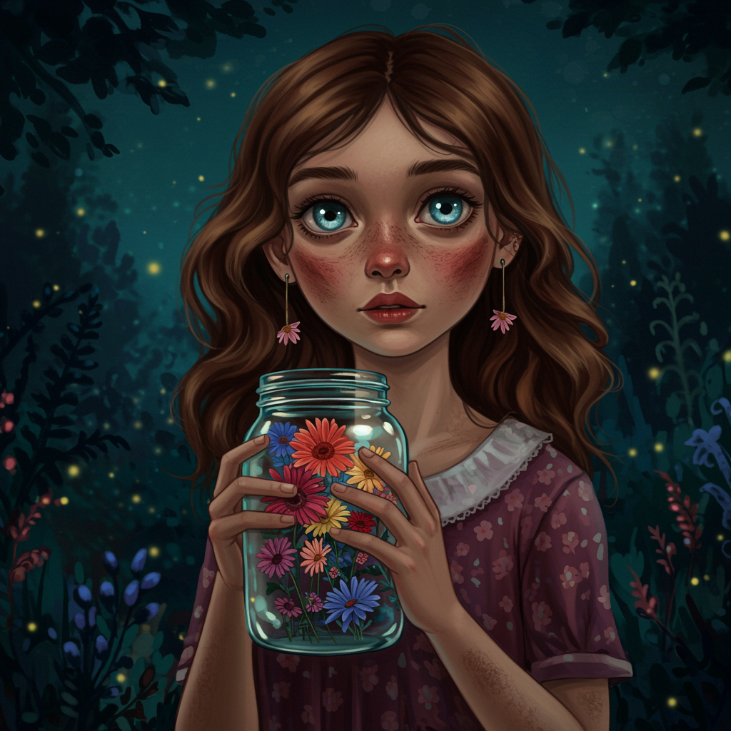 A portrait of a girl holding a jar filled with vibrant flowers, set in a whimsical, dreamlike landscape. The scene is rendered in a style reminiscent of detailed storybook illustrations, with glowing, rich colors that create a sense of enchantment. The background is a mysterious nocturnal setting, with multidimensional shading and a sense of depth that draws the viewer into the scene. The girl's face has a hint of curiosity and wonder, her eyes reflecting the soft glow of moonlight, while subtle details like delicate earrings and a slightly dirty face add character. The image captures an ethereal, timeless quality that feels both magical and grounded in a fairy-tale reality.