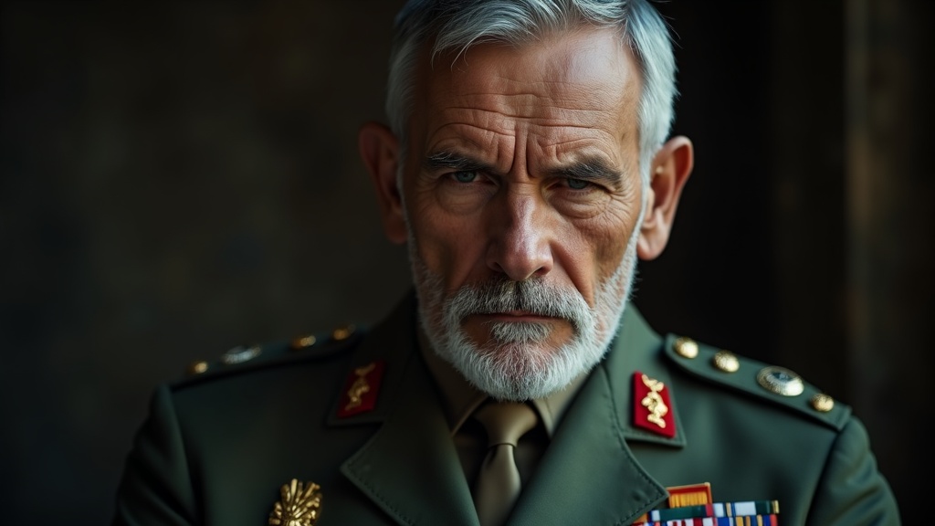 Close-up portrait of a 62-year-old battle-hardened decorated general, clean-shaven, with a serious and stoic demeanor. Captured in a cinematic style with epic detail, the photograph is shot in 4k on Kodak film. It features a richly detailed bokeh background that adds to the dark and moody ambiance, reminiscent of an HBO production.