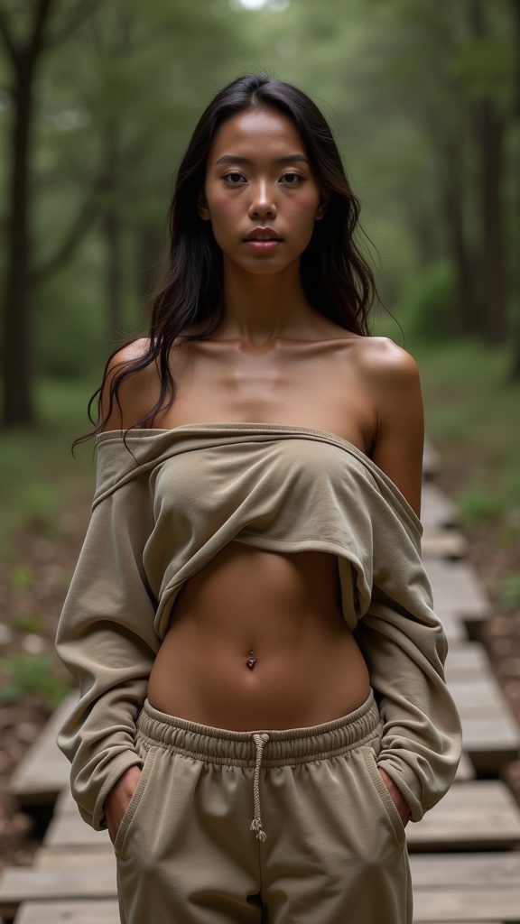 A 24-year-old Cree-Kanak female dancer exudes victorious elation, her expression playful yet powerful. Her prominent, smooth collarbones gracefully taper into defined shoulders, accentuating her toned muscles and abs. Her physique is striking, with a flat chest and small breasts. Her skin is a deep, rich brown with cool undertones, flawlessly even and smooth, showcasing visible pores and texture. Her thin crescent-shaped eyes are a calm, muted green, framed by long, elegant eyelashes, beneath mini arch-shaped eyebrows that perfectly complement her delicate features. She wears overly large, asymmetrical sweatshirts and paneled harem pants with abstract cuts, revealing her midriff. Her hands rest in her pockets, a slight, confident smile playing on her lips. The composition follows the rule of thirds, with a background of disjointed wooden planks forming a pathway, reminiscent of the enigmatic style of H. R. Giger with subtle creative alterations.