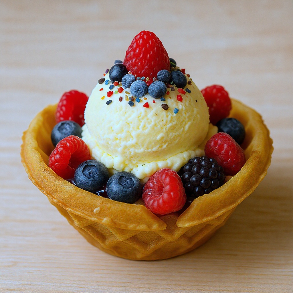 View this AI-generated image featuring scrumptious ice cream nestled in a half moon waffle bowl adorned with a medley of fresh berries and sprinkled with an array of tantalizing toppings. Created using advanced AI technology, this image showcases creative visuals, AI artwork. Perfect for creative pr