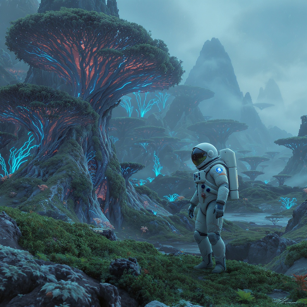 View this AI-generated image featuring an astronaut exploring a lush green alien landscape set against a backdrop of distant towering mountains and strange luminescent flora the scene is a masterpiece of sci fi art with atmospheric lighting casting ethereal glows across the verdant terrain the intri