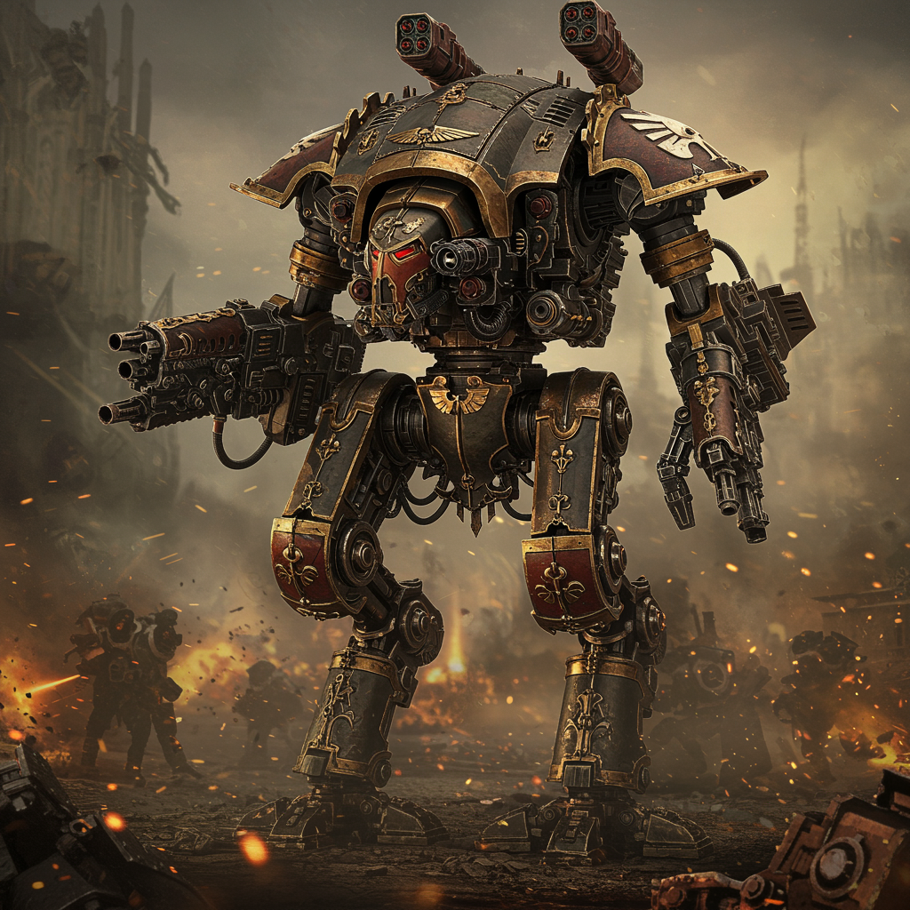 A majestic and intricately designed combat robot, reminiscent of the Warhammer 40,000 universe, stands poised in the midst of an epic battle scene. Its armor glistens with exquisite golden hues, capturing the essence of a masterpiece in motion. The hyperdetailed construction showcases an array of advanced weapons, each expertly crafted to perfection. Warm, dramatic lighting casts dynamic shadows, enhancing the robot's imposing presence. The background is a complex tapestry of chaos and grandeur, with faded elements suggesting a grand narrative unfolding in the distance. The cinematic composition of the scene envelops viewers, immersing them in a hyper-realistic depiction of futuristic warfare.
