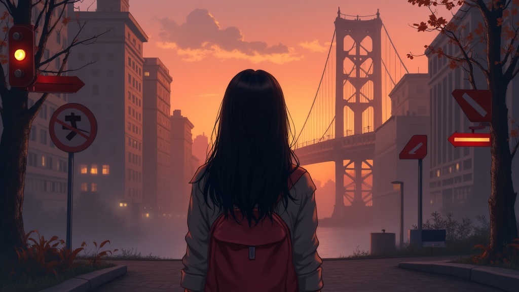 Masterpiece, high quality, flat color, limited palette, soft contrast, young woman, long sleek black hair, glowing aura, backpack, gazing into distance, standing still, misty atmosphere, twilight sky, urban landscape, evening glow, tall buildings, iconic bridge, directional signs, deep perspective, frame of view, rich blacks, warm reds, burnt oranges, earthy browns, fall setting, dreamlike haze.