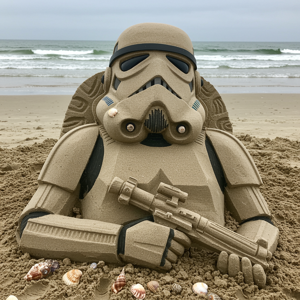 A meticulously crafted sand sculpture depicting a stormtrooper, intricately detailed and beautifully designed, graces the beach; subtle modifications nod to the ocean's influence, with seashells adorning the armor and gentle wave patterns tracing the helmet.