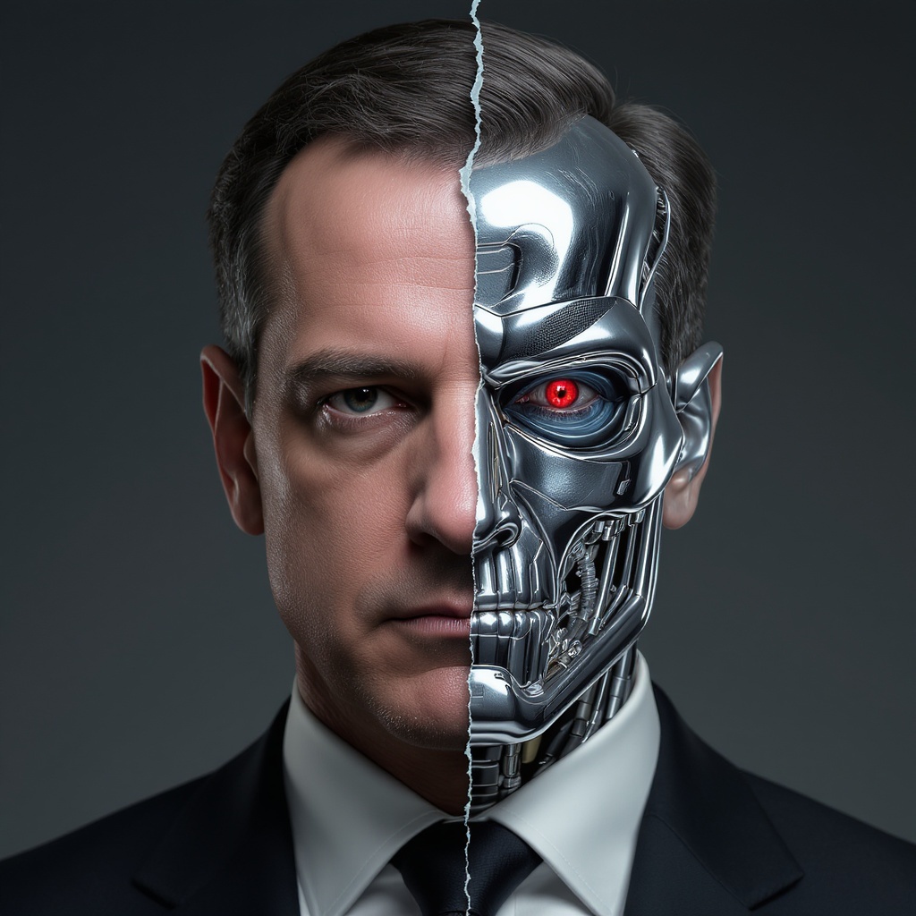 View this AI-generated image featuring a dramatic front facing close up portrait of mariano rajoy in a sharp suit reminiscent of the t 1000 from terminator 2 the composition features perfect symmetry with his face divided vertically into two contrasting visual styles the left half is hyper realistic