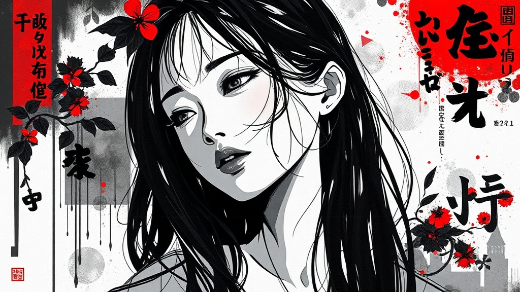 Aesthetic two-tone black and white composition featuring simplified shapes with a figurative focus, blending styles of acrylic painting, watercolor, and oil painting with aspects of photography and digital art. Emphasizing brush strokes and a vibrant dark red color pop, the scene presents a gorgeous young Asian girl. The image is highly detailed and intricate, merging low poly abstract surrealism with Japanese Kanji and Katakana text elements. Niji, graffiti, comics, and anime styles intermingle, creating a visually stunning and harmonious portrayal.