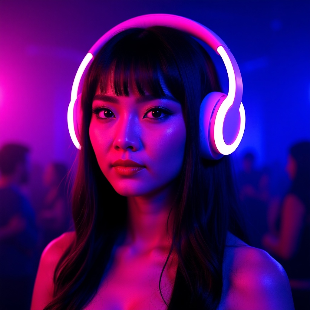 A stunning black-haired Asian woman with futuristic abstract headphones, illuminated by vibrant pink and blue neon lights in a dynamic night club setting, high-resolution, lifelike photo, expertly captured with a cinematic angle, showcasing ethereal light shimmering around her.