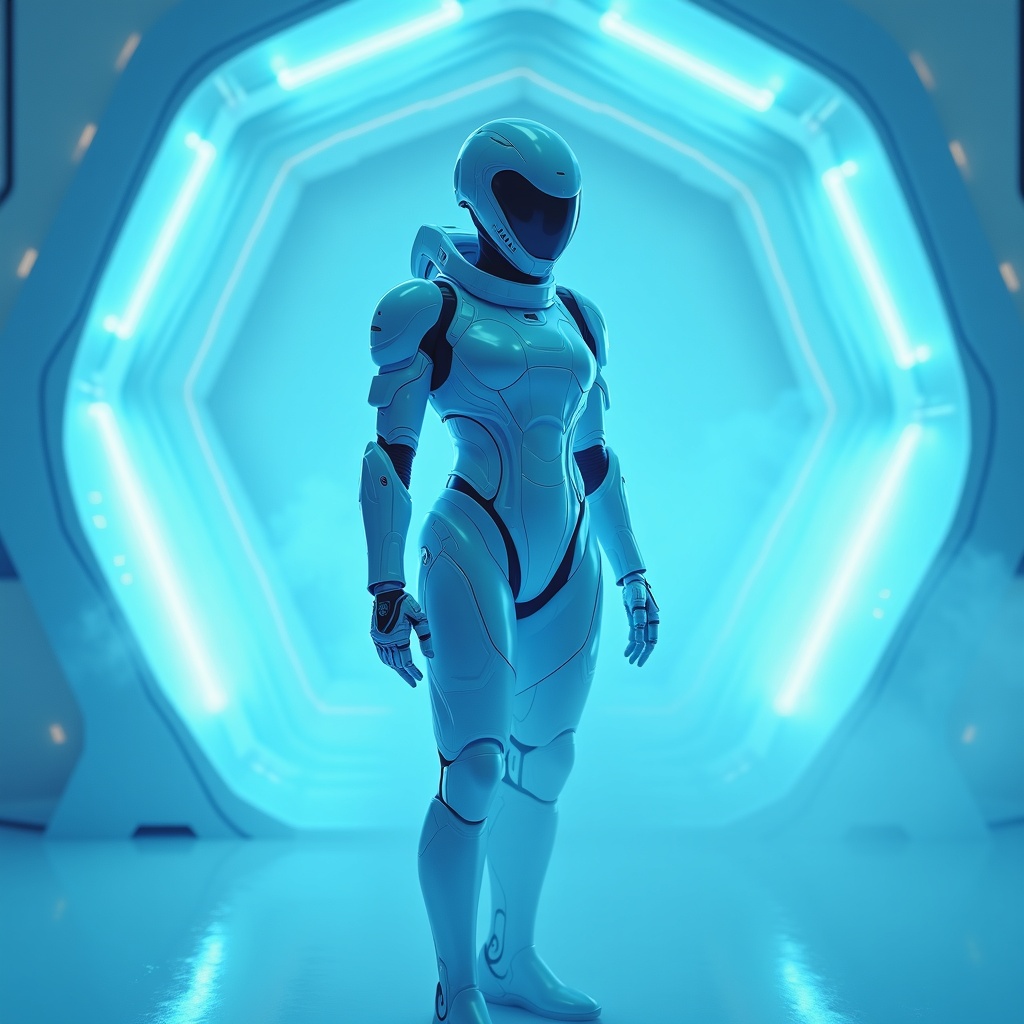 A high-tech female sci-fi military cyborg adorned with sleek white Teflon armor, complete with a highly detailed helmet and intricate mask. Her design radiates a cyberpunk aesthetic with neon blue accents and glowing rays of blue light. She stands in a white technical room adorned with intricate geometric designs, illuminated by a vibrant blue energy beam that casts dynamic reflections. The scene employs advanced 3D rendering with ray tracing, achieving the highest quality and detail typical of a fantasy movie style. Enveloping her in dramatic volume lighting, the environment incorporates elements like Bokeh and Long Exposure effects, in stunning 8K HDR resolution. The setting is enriched by the presence of dynamic geometric shapes like triangles, hexagons, and flexible polyhedrons, all rendered in a mist-enshrouded futuristic ambiance with pulsating plasma energy.