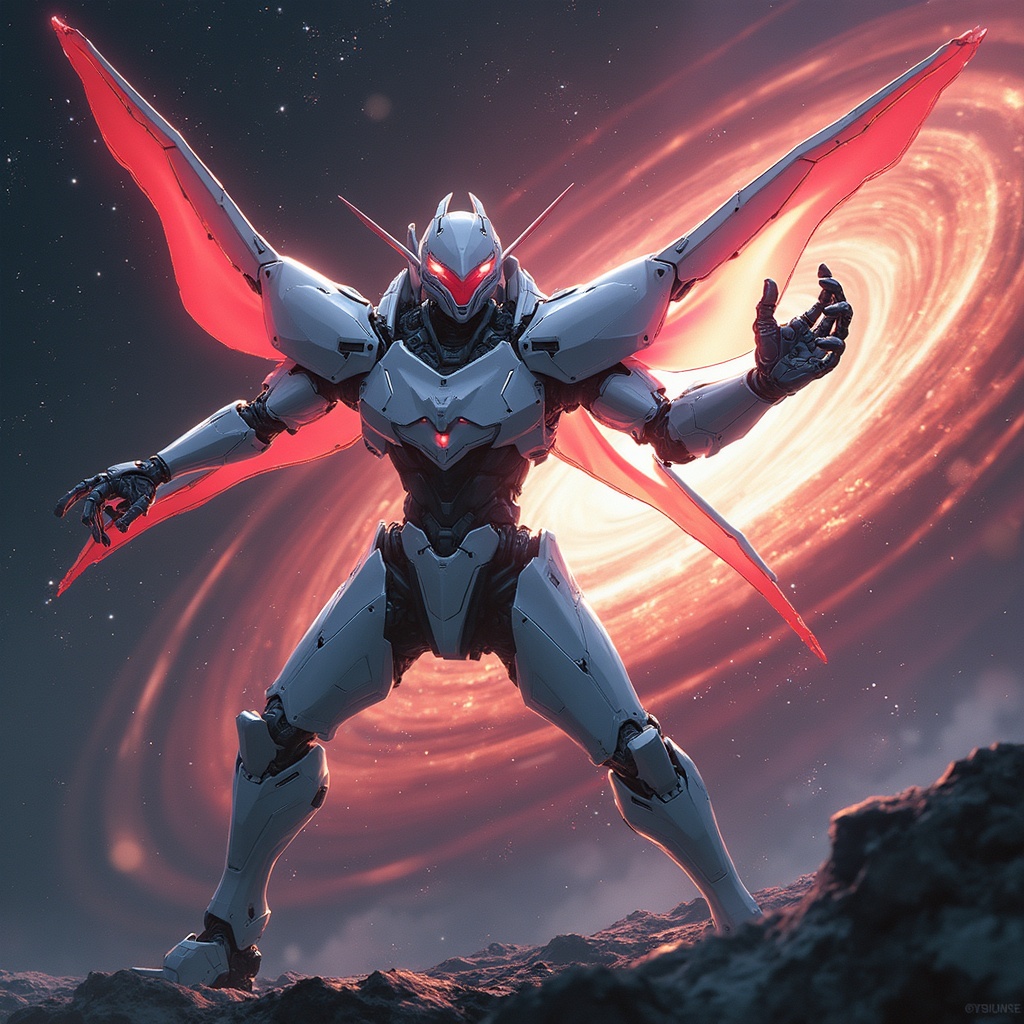 Portrait of a streamlined sci-fi mech in a slender figure striking a dynamic fighting pose. The design is glossy white with red accents, featuring detailed insectoid characteristics, complete with sci-fi wings, influenced by the styles of Tsutomu Nihei and Akira. Set against the backdrop of a brilliant quasar in outer space, the scene is enriched by a dramatic and vibrant cosmos filled with stars and quasars. Powerful beams and a plasma blast wave create an intense atmosphere, framed in 8k ultra-high-definition quality. This hyper-realistic anime art captures complex lighting and bright flashes, with a focus on three-dimensional graphics and manga-style intricacy.