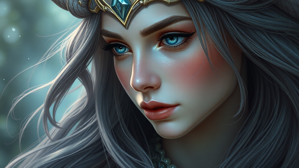 Portrait of mystical elven maiden, exquisite, delicate details, digital painting, artstation-style, concept art, silky, crisp clarity, illustration, akin to art by artgerm, greg rutkowski, and alphonse mucha, 8k vibrantcolors.