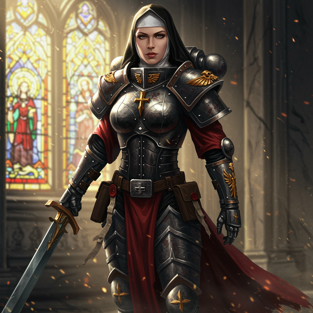 View this AI-generated image featuring a full body portrait of a devout sister of battle in an action scene featuring a beautiful woman standing before a stained glass window her face is symmetrical with reflective eyes dark eyebrows and subtle makeup she wears intricate sci fi nun armor styled in w