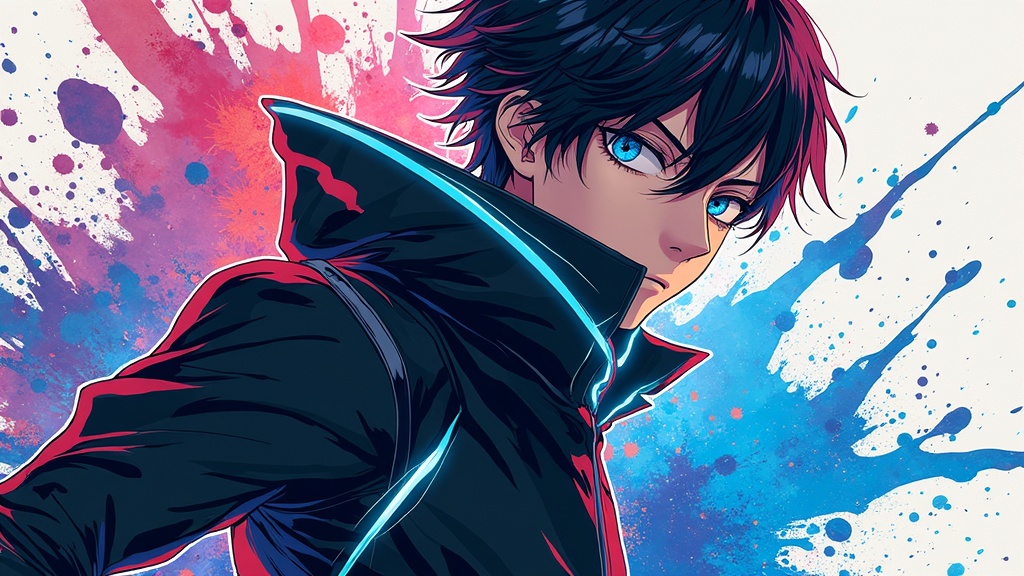 Vibrant anime poster featuring a dynamic male hero clad in sleek black, accented with striking white and electric blue details, his intense gaze conveying determination. The artwork is inspired by Yoh Nagao's style, blending a captivating mix of vibrant colors and intricate patterns. Surrounding the character, a radiant explosion of ink splashes and light bursts creates an exhilarating, lively background, emphasizing motion and energy. Subtle hints of abstract geometry and texture add depth to the composition, making it both visually stunning and evocative.