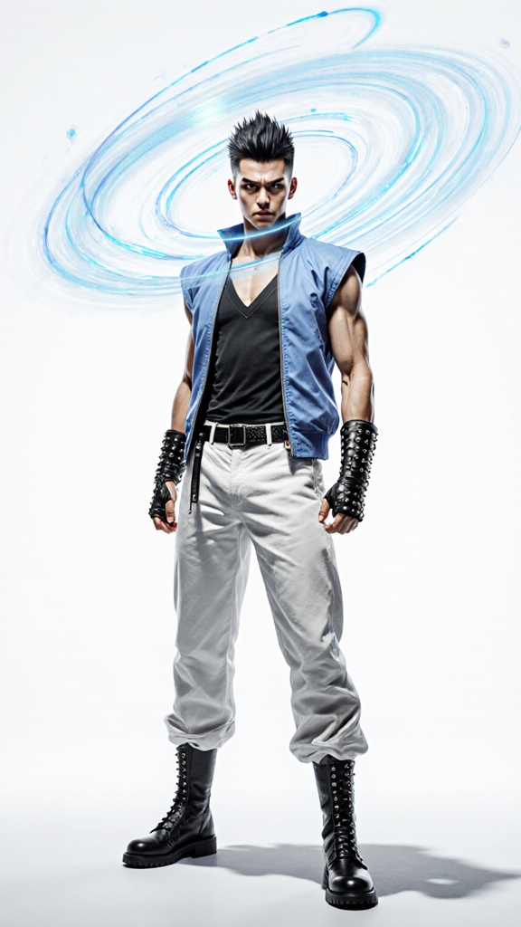 Male super-hero of Asian heritage, probably Japanese-American, ultra futuristic cyberpunk style. Tall, slim but muscular, sinewy. Short, black spiky fade hairstyle, close cut on the back and sides, longer on top. Black eyes, strong brow and jaw, high cheekbones. Clean shaven, no facial hair. Sleevless V-neck jacket, periwinkle blue in color, pointed at the shoulders. Pants are white and slightly baggy cyberpunk style, tapered at the bottoms, but roomy enough for him to fight. Black leather belt with metal studs around his waist. Short black leather bracers around his wrists. Black leather ankle length boots on his feet. Pale blue energy swirls around the crown of his head like an atom, constantly moving. He is a psionic with telekinesis and telepathic powers. He can move objects with his mind and attack with mental energy. Full body pose, likely using his power to levitate.