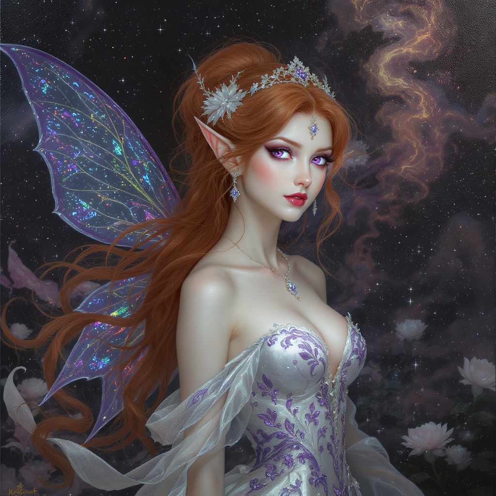 View this AI-generated image featuring oil painting an enchanting female fairy with flowing red hair vivid purple eyes and delicately pointed elf ears her hair cascading down in a graceful ponytail shimmering translucent fairy wings that reflect a spectrum of colors adorned in an elegant white dress