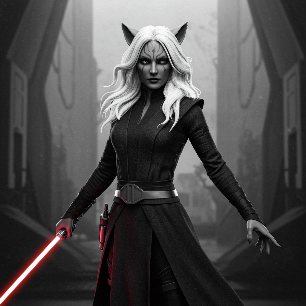 A striking portrayal of a Sith lady with sleek, flowing white hair and elegant cat-like ears, her alluring face chiselled with hyperdetail. She stands poised in a dynamic pose, exuding an aura of power and grace. The immersive background envelops her in an intricate grayscale landscape, with depth of field enhancing the scene's focus and dimension. This monochrome masterpiece captures an air of mystery and dominance, an 8k visual symphony. Crafted with enhanced anatomy and image refinement, no distracting elements detract from its precision, a testament to her fierce and commanding presence within the STAR WARS universe.