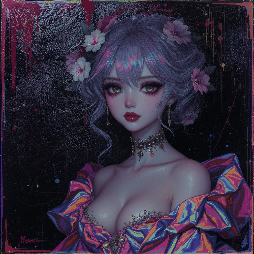 Thick acrylic illustration, stunning anime girl, oil painting, vibrant iridescent reflection, flower accents, chiaroscuro effect, divine cinematic rim lighting, rococo art CGI style, 3D, doll-like features, octane render, low resolution imperfections, text elements, glitches, cropped composition, intentionally flawed quality, jpeg artifacts, peculiar, unintended duplicates, eerie, distorted, partially visible frame, inaccurate hands, unconventional facial features, creative mutations, blurred details, unique anatomy, intriguing proportions, unexpected limbs, mirrored face, abstract proportions, altered limbs, absent arms or legs, extra or fused fingers, extended neck.