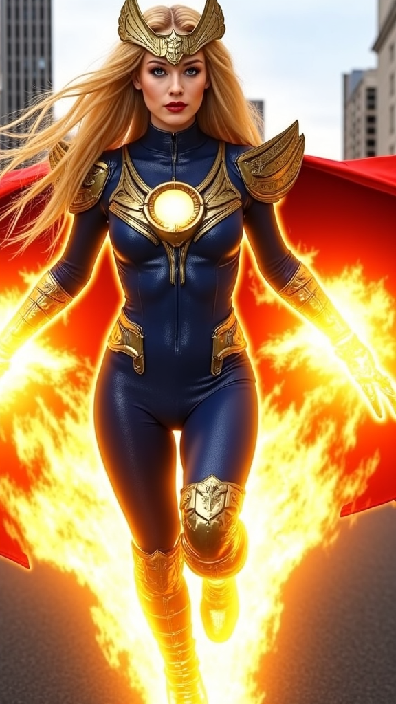 Female superhero, fire based character. Caucasian female, tall, slender, athletic build, modelesque. Long golden blond hair, layered tresses. Ethereal beauty, liquid amber eyes, long lashes. Red lips. Her costume is a form-fitting bodysuit that covers her from neck to feet; it is a shimmering deep azure blue with metallic flecks on the surface, gold strips up the sides of the legs, ribs and arms. Metallic gold thigh high boots that blend into the legs of her bodysuit. A shiny metallic gold falcon symbol on the front of her chest, the wings flare out from her shoulders. There is a circlet/headdress with stylized metallic wings that flare from the sides, her long wild hair flows and falls over and around it. A short fire-red cape shaped like a pair of wings is attached to her arms, they flare out to create glider wings. She can create and project flames of all shapes and sizes, burning bright intensity. She can fly, her cape extends from her arms to form glider wings and blows in the wind. There is a flamelike aura surrounding her when her powers are in use. Full body pose, flying through the city and burning bright.