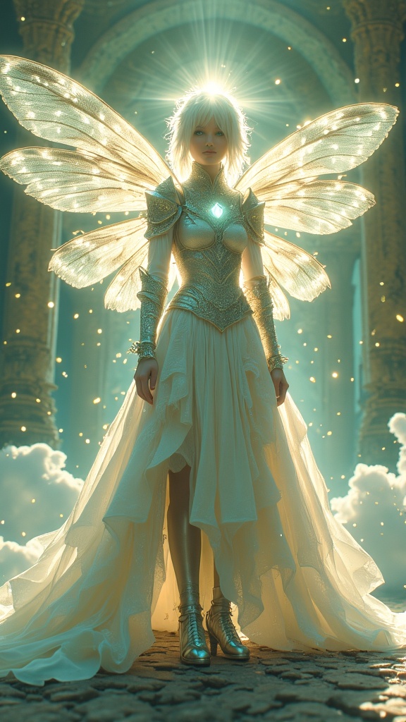 Cosmic, universal. The light of Heaven is with her, no shadow dares approach her. Faery Queen and Archangel in one. Sylph, fairy. Regal, royal, elegant. Beautiful young face, shining chartreuse green eyes with long blond lashes. Short white-gold hair, side swept on one side forming a beautiful braid in the back of her head, side swept bangs fall over her eyes. Over her head is a halo made of stars, with the center star being the brightest. Elvish ears. Delicate model face with glossy pink lips. A white lace collar with a diamond at the center around her neck. She wears a white pearlescent royal long sleeved tiered gown, embedded with crystals, a silver belt with diamonds around her waist. The tiered bottom half of her dress is shorter on the sides, revealing long lovely legs. On her back is an enormous, over-sized pair of dragonfly wings, translucent and iridescent with all the colors of the rainbow/spectrum. She wears a pair of silver high heels with silver gladiator straps. She leaves a cloud of glitter wherever she flies. She shines with a silver light/aura, she radiates light and power. Full body pose, opening a portal to Heaven and entering the light...