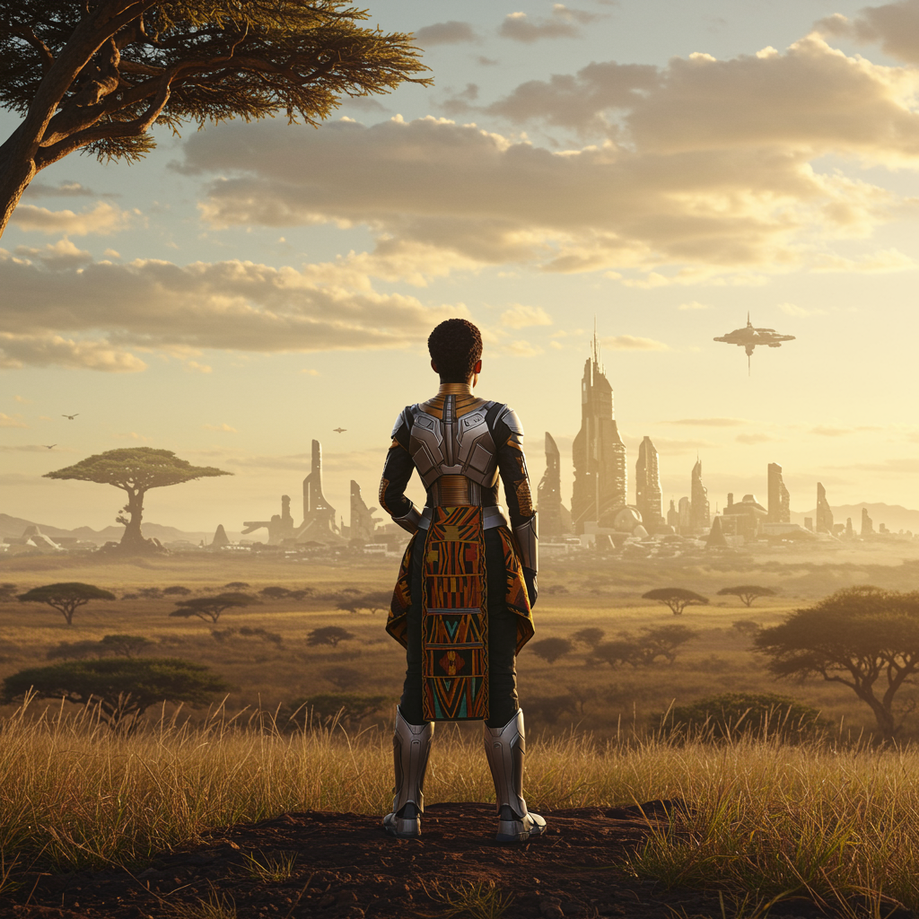 In the golden hour of a 24th century Serengeti, a stunning Eritrean space captain stands tall on a hill, clad in an exquisite blend of Vibranium armor and intricate black and gold kente cloth design. Her battle dress, a testament to her strength and heritage, gleams warmly under the sun's embrace. With hands confidently clasped behind her back, she gazes towards the horizon, sharp eyes taking in the futuristic cityscape reminiscent of Wakanda, a symbol of her people's resilience and advanced civilization. Her return after a seven-year mission along the Milky Way's outer spiral arm fills the scene with a mix of epic grandeur and heartfelt emotion. The vista is a harmonious blend of Afro-futurism and cinematic flair, inspired by the likes of "Interstellar" and "Black Panther," capturing the dual majesty of nature and innovation, as envisioned by a visionary director.