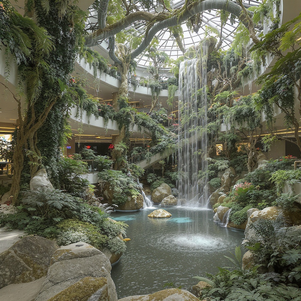 View this AI-generated image featuring epitome of biophilic design expansive public atrium interior filled with lush greenery cascading indoor waterfall feature vibrant verdant elements created with unreal engine photorealistic cgi 3d art seamlessly rendered despite attempts to maintain high quality
