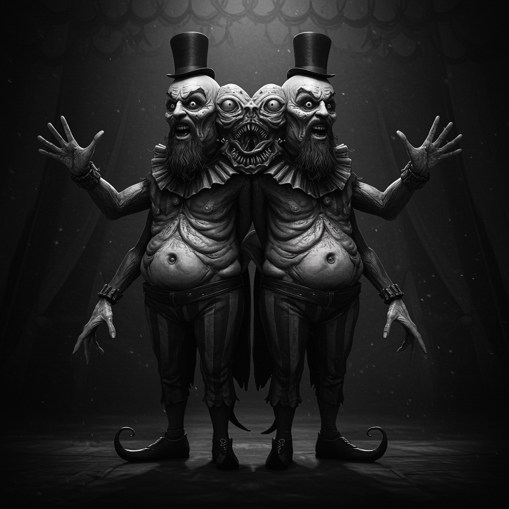 A diabolical and unhinged master showman presides over a shadowy and grotesque circus, where horror and darkness reign. The intricate design and details are accentuated by dramatic lighting that casts eerie shadows. This photorealistic and cinematic scene reveals two characters with dual faces, each embodying the distorted art of the circus. The pair has oversized heads, long beards, and pointed footwear. Fused fingers and mutated limbs defy logic, adding to the nightmarish atmosphere. Their disfigured forms feature multiple anomalies—extra navels, convoluted anatomy, and disappearing limbs. The entire scene is engulfed in an unsettling black-and-white filter, reminiscent of an old, haunting photograph. Despite the chaos and disarray, the spectacle remains strangely compelling, inviting viewers into its twisted, surreal world.