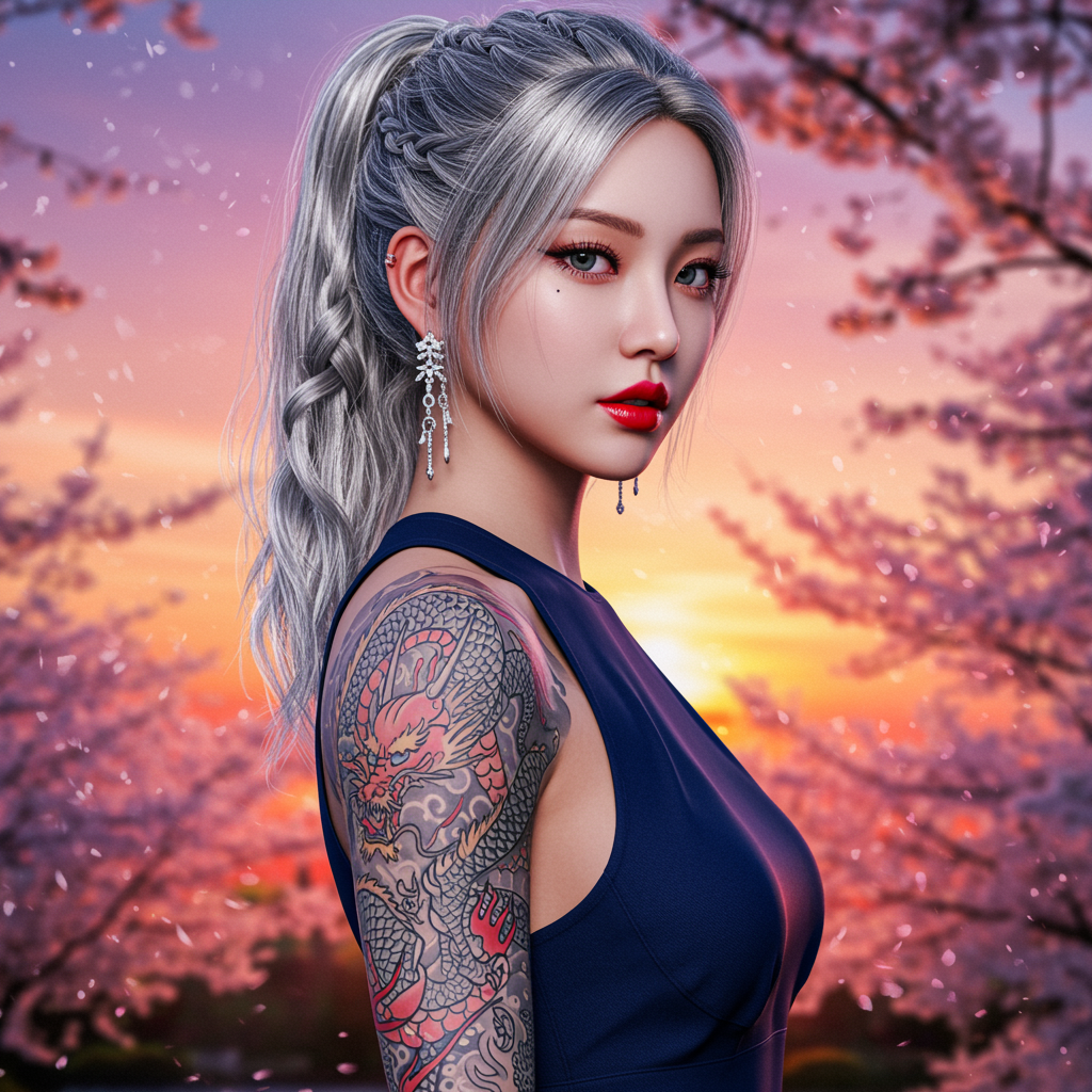 Hyperrealistic portrait of a captivating Korean K-pop idol with a silver braided ponytail and vibrant red lips, showcasing an elaborate full-sleeve dragon tattoo. She is wearing a sleek, form-fitting navy blue sleeveless dress, set against a stunning sunset backdrop over a cherry blossom garden. Captured with a Canon R5 and a 135mm lens for a soft bokeh effect, the image highlights her expressive, meticulously detailed face in pristine 8k HD quality.