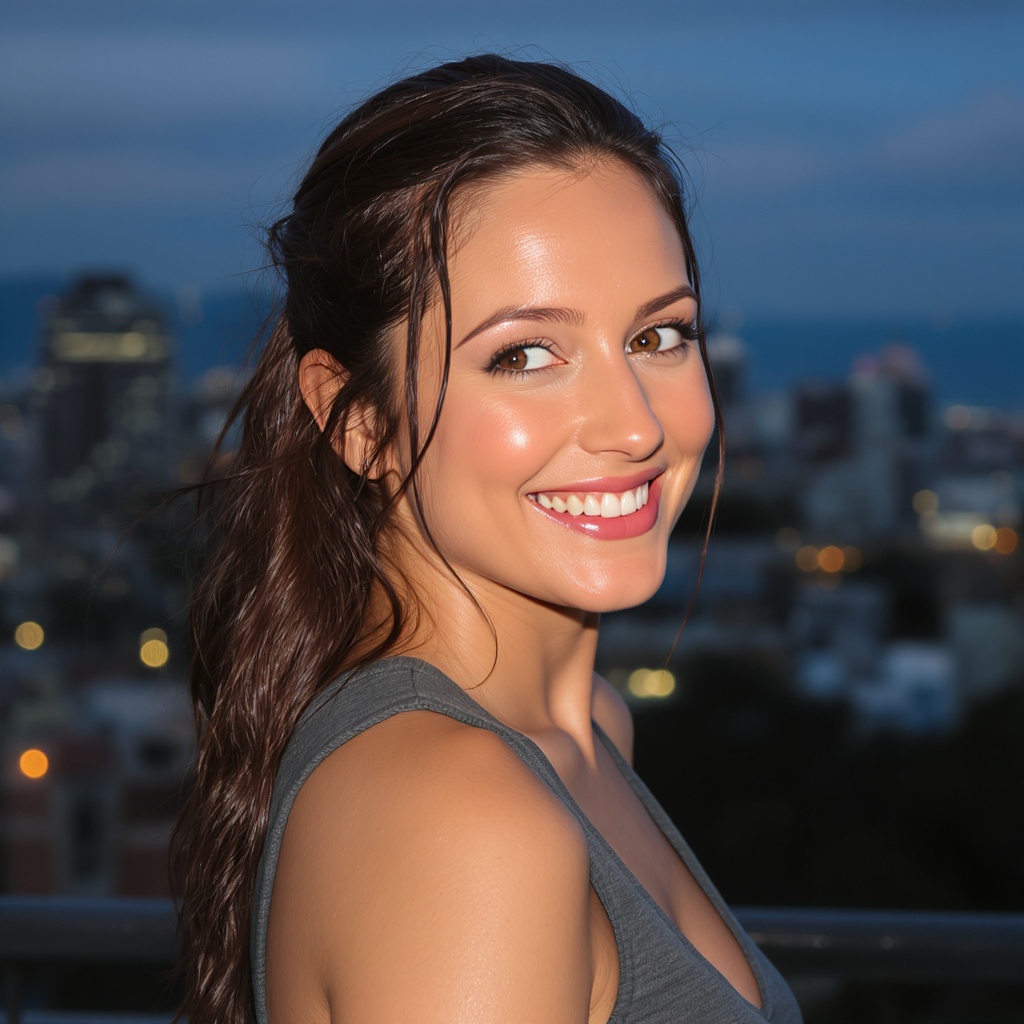 A portrait of a cheerful woman with damp, slicked-back chestnut hair cascading over one shoulder. Her gaze meets the camera with a warm, inviting smile and a subtle head tilt. She dons a sleeveless charcoal top, accentuating her naturally glowing makeup that enhances her features. The scene is set against an urban skyline at dusk, with soft city lights twinkling in the background.