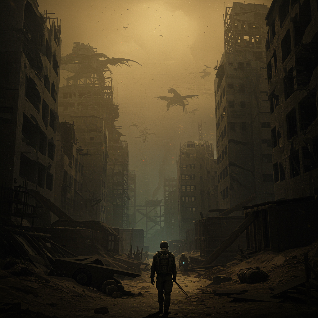 View this AI-generated image featuring epic scene depicting the end of the world with a realistic portrayal of an apocalyptic landscape abandoned structures loom under a night sky painted in neutral tones intricate building details fill the complex background enhanced by cinematic elements like scre