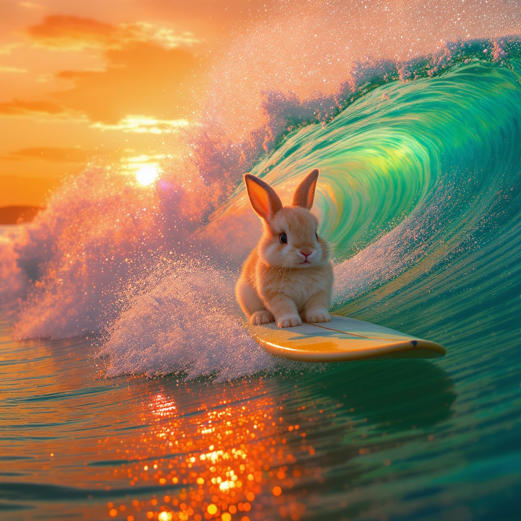Photorealistic 32k scenery of a fluffy baby bunny expertly gliding on a vibrant surfboard amidst a crystalline wave, illuminated by the warm and golden hues of a cinematic sunset casting long, ethereal shadows; the dazzling spray of the ocean glitters, capturing the essence of freedom and exhilaration in a whimsical yet breathtaking tableau.