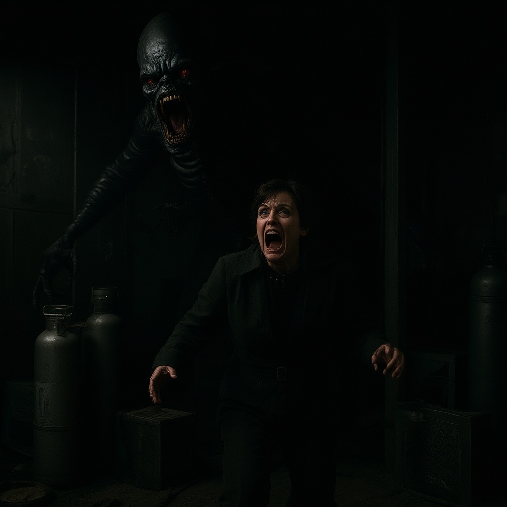 A chilling scene unfolds as a terrifying alien looms above, its predatory stance casting a shadow in the dimly lit room. In front, Ellen Ripley, portrayed by Sigourney Weaver, screams in terror, her face a portrait of fear and determination as she attempts to flee from the relentless creature. The room is cluttered with industrial equipment—oxygen tanks and metal crates strewn about—enhancing the sense of claustrophobic danger. The lighting is stark and atmospheric, casting long shadows against the room's metallic surfaces, captured in a wide-angle shot with a raw, film-like quality reminiscent of a Sony ALPHA 7R V camera. The cinematic lighting adds depth and intensity, creating a visceral, immersive experience.