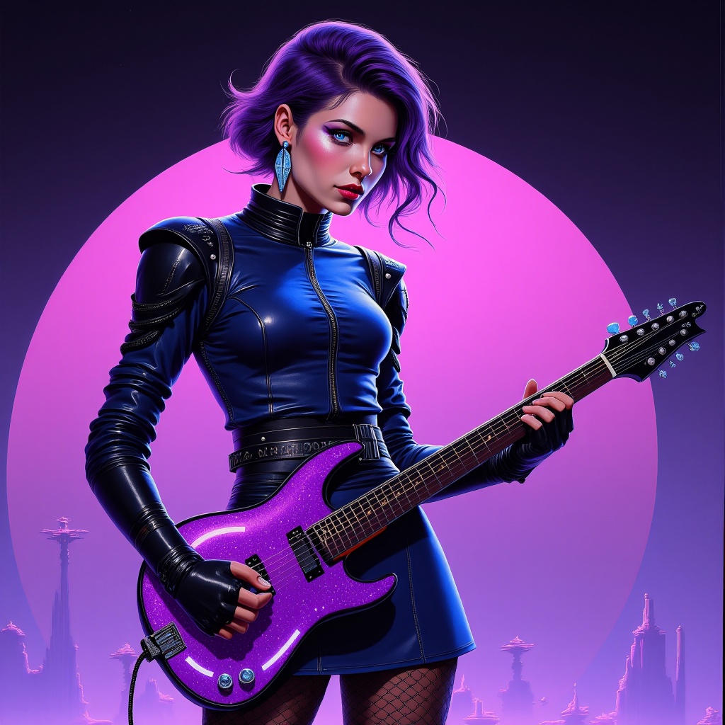 Superheroine, hologram, alien punk rock, new wave rockstar. Sparkling, glittering, caucasian female, tall, strong, beautiful, ethereal, edgy. Medium shoulder-length hair, dark violet with periwinkle and lilac highlights, swept back on one side, spiky curls falling over one eye. Beautiful model face, high cheekbones, silver/grey eyes, mascara, eyeliner, shimmering eyeshadow. Crystal spear earrings, shimmering violet lipstick. Metallic dark blue long sleeved shirt with zippers, shiny black shoulder pads. Black leather bracers, black studded leather belt with glowing violet circle buckle. Metallic dark blue miniskirt, black fishnet stockings, stiletto knee-high boots. Holding glowing purple synth-guitar, seeing sound waves, full body pose