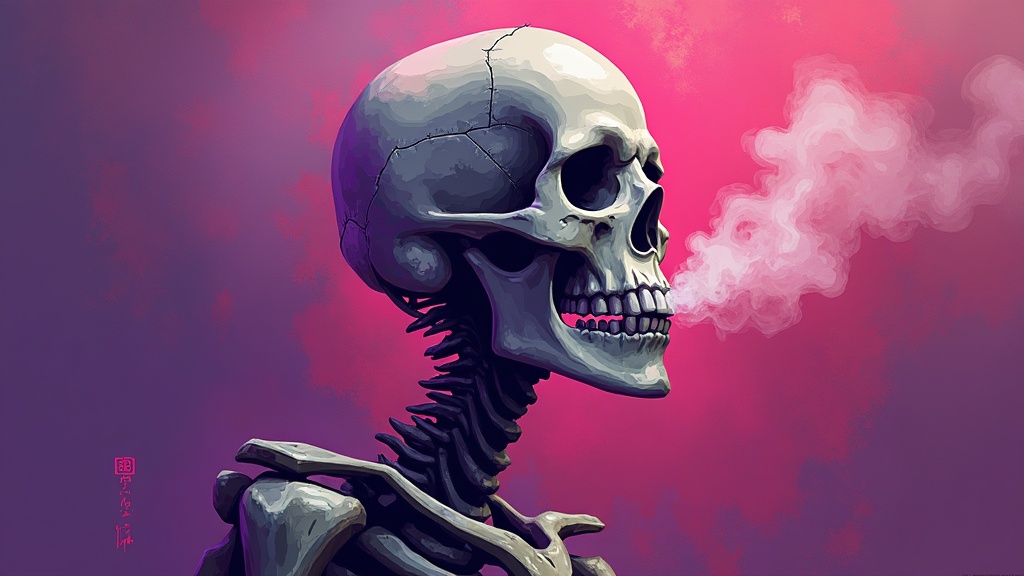 A modern digital illustration of a smoking skeleton, featuring a vibrant mix of purples, pinks, and earthy tones, with swirling smoke adding a dynamic and ethereal quality to the scene.