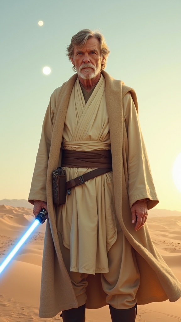 A full-length portrait of an older Luke Skywalker, depicted in a realistic style, stands confidently against a pale desert landscape reminiscent of Tatooine. His weathered Jedi robes, tinged with subtle shades of earthy browns and creams, flow gently in a soft breeze. His expression is serene yet determined, with piercing blue eyes that reflect years of wisdom and countless adventures. The iconic lightsaber, now with a slightly altered hilt design featuring intricate engravings, is ignited in his hand, casting a faint blue glow. Overhead, a clear sky stretches out, while twin suns begin their descent towards the horizon, painting the scene in warm, golden hues.