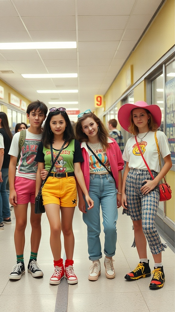 View this AI-generated image featuring quirky snapshots of retro 90s mall kids in vibrant vintage outfits captured with the nostalgic grain of a camcorder. Created using advanced AI technology, this image showcases vibrant colors. Perfect for creative projects, digital art, inspiration.
