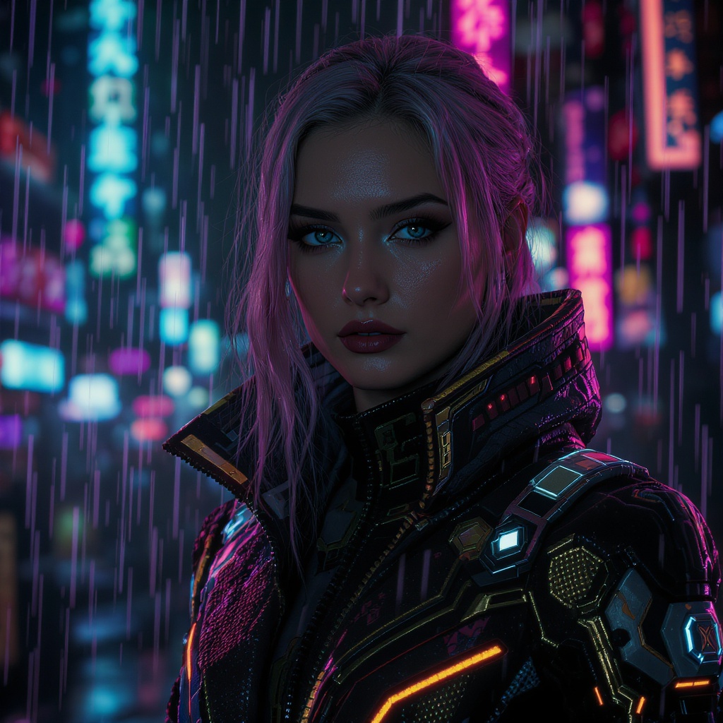 A detailed portrait of a European young girl in a Storm Rain movie jacket coat, exhibiting futuristic sci-fi fashion with hints of royal attire, inspired by artists like Ismail Inceoglu, Dragan Bibin, and Greg Rutkowski. Her face is perfect with a sharp chin and finely detailed features, set against a cyberpunk, neotokyo, synth-wave aesthetic. The scene resembles a Bladerunner movie moment, bathed in low-emission neon, with dramatic lighting and rich colors that enhance the hyper-realistic textures. Captured in ultra-high resolution, this CG image employs physics-based rendering, showcasing a hyperrealistic appearance. The jacket coat combines elements of futuristic design and traditional attire, with an emphasis on synth-wave aesthetics, creating a unique fusion of styles. Her eyes convey a sense of mystery and depth, drawing the viewer into the scene. This visually striking portrait stands out with its vibrant colors and intricate details, presenting a harmonious blend of fashion and futuristic elements.