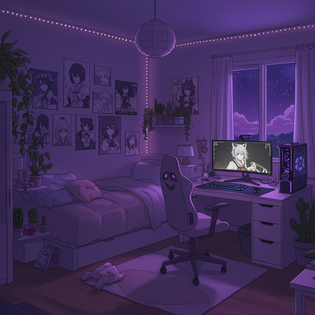 A dreamy anime-style bedroom bathed in the gentle glow of purple soft lights creates a serene nighttime ambiance. The room is adorned with an array of lush green plants and cute cacti that add a touch of nature to the space. A cozy bed with plush pillows is tucked into one corner, surrounded by posters of favorite anime characters, hinting at the occupant's passion for visual novels and gaming. A sleek gaming setup occupies one side, complete with a high-end monitor and a colorful keyboard, reflecting the otaku lifestyle. The overall aesthetic is one of comfort and charm, making it a perfect retreat for any anime enthusiast.