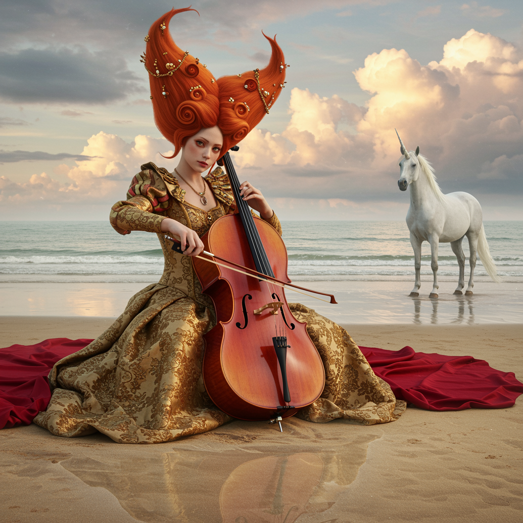 A surreal beach landscape unfolds with vivid imagination, featuring a female figure with delicate, refined facial features seated gracefully on the sandy shore. Her pale skin and striking, curious eyes draw attention, while her vibrant orange hair, styled in whimsical curls resembling a decorative horn, shimmers with golden embellishments. She elegantly plays a large cello, its deep, resonant sound mingling with the ocean breeze. Her attire is mesmerizing — a sumptuous golden gown adorned with intricate patterns flows around her, blending seamlessly with the shimmering sand, accompanied by a dramatic, flowing red cloak. In the background, the ocean glistens mysteriously under a moody sky, filled with fluffy, pastel clouds hinting at an impending change in the weather. To the right, a mythical white unicorn stands gracefully on the shore, its calm gaze fixed on the horizon, adding an enchanting element of fantasy to the scene. The atmosphere is utterly dreamlike, a perfect blend of reality and imagination. Soft waves lap at the shoreline while the ethereal music from the cello resonates throughout the surroundings. Rendered in a style reminiscent of Michael Cheval, Michael Whelan, Alex Alemany, and influenced by the surrealism of Dali, the scene's vivid colors and ambient occlusion create a masterpiece rich in texture and detail. Reflections dance across the scene, enhanced by diffuse lighting and volumetric effects, lending it a polished, ultra-real quality. The landscape is captured in breathtaking 128K ultra-high-definition, with psychedelic touches and a soft glow that accentuates its dreamy, atmospheric quality, resulting in a stunning, photorealistic artwork where reality blurs with fantasy.