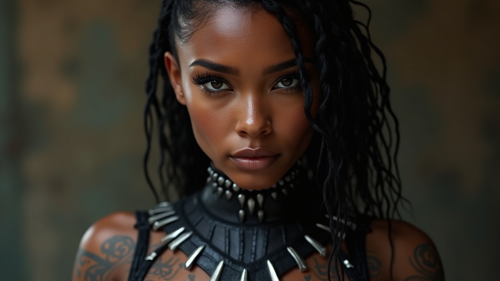 Female cosplaying as Black Panther, adorned with intricate tattoos, gazing directly at the viewer, capturing a detailed portrait with the realism of photography. Her skin is rendered with striking clarity, in an 8k detailed, photo-realistic quality. The scene is set in a full-length frame, showcasing high-detail RAW colors. The lighting is softly diffused, creating a cinematic ambiance with a shallow depth of field for a sharp, focused appearance. The portrait exudes hyperrealism, blending elements of 3D modeling, with subtle hints of cartoon and anime influences. Despite realistic skin textures, minor imperfections like skin spots and blemishes add authenticity. Her piercing gaze is complemented by a muscular physique, maintaining a sense of strength and intensity.
