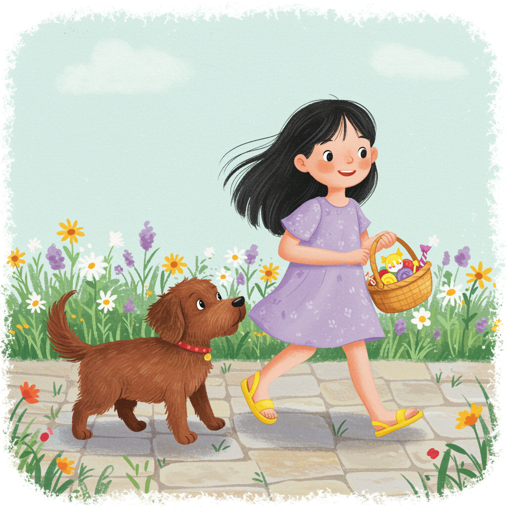 A whimsical children's book illustration depicting a young girl with flowing black hair, dressed in a lavender dress and bright yellow sandals, walking joyfully alongside her faithful pet dog with warm, cocoa-brown fur. In her hand, she clutches a colorful basket brimming with assorted sweets. The scene is painted in soft pastel hues, capturing a serene and cheerful day. The two friends stroll along a cobblestone path lined with blooming wildflowers, their silhouettes bathed in the gentle glow of the afternoon sun. The overall mood is playful and heartwarming, appealing to the imaginations of young readers.