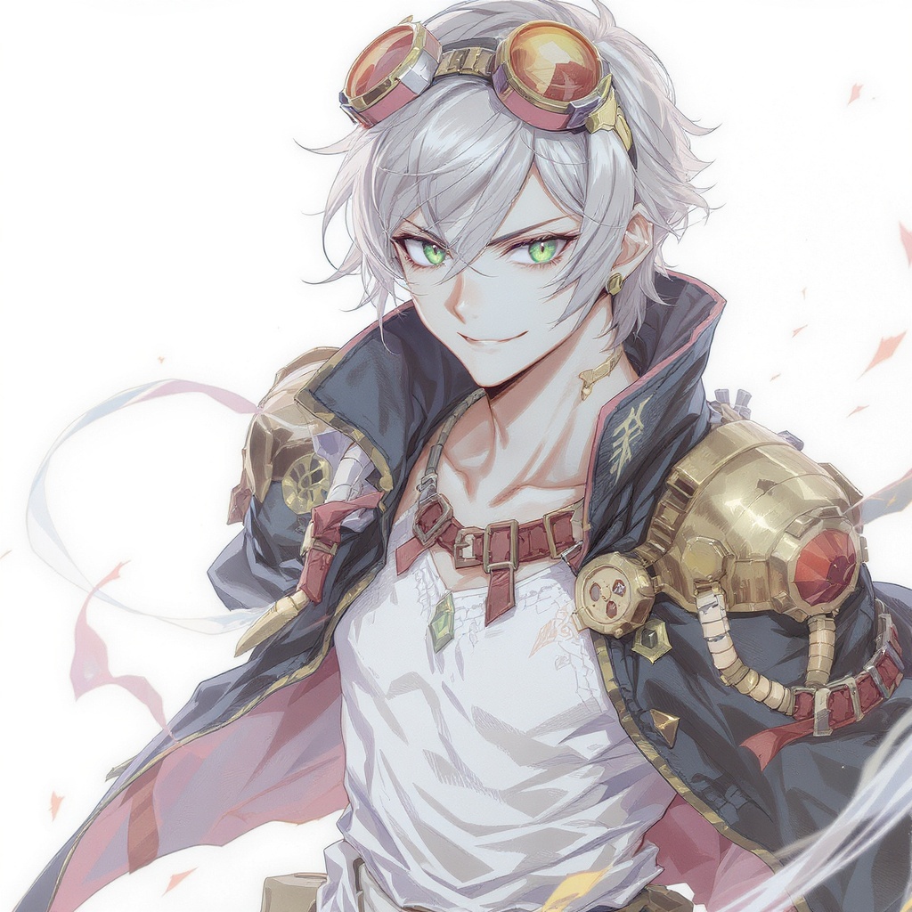 View this AI-generated image featuring image of a 16 year old young man with light gray hair and striking green eyes wearing a white tank top underneath steampunk inspired attire the character is depicted in an anime style with a dynamic pose exuding a sense of energy and movement the artwork is ext