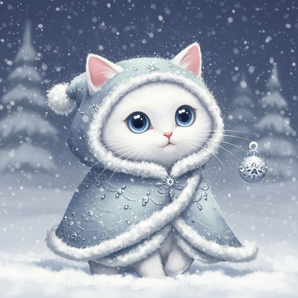 A whimsical white cat with an endearing, kawaii charm and an air of magic, wrapped in a winter fashion ensemble adorned with delicate silver filigree. Surrounded by a dreamlike, ethereal snowy landscape, the scene captures a serene blend of snowy wonder and celestial sparkles. Drawing inspiration from the enchanting styles of Yoshitomo Nara, the surreal elegance of Ray Caesar, and the enchanting worlds of Studio Ghibli, the design exudes a mystical ambiance. The cat's eyes glimmer with curiosity, its fur glowing softly amidst the gentle snowfall, evoking a sense of wonder and tranquility.