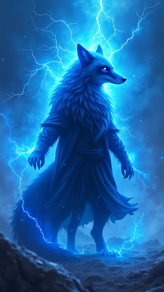 Majestic dark fox emanating intense dark blue flames of mystical energy, an anime-style sorcerer humanoid prince of shadows reigning supreme on a battlefield. Surrounded by a backdrop of vibrant blue infernal flames and electric sparks, he stands amidst an apocalyptic scene, rich in color and intricacy. This elegant digital illustration captures the dramatic, hyper-detailed chaos of a thunderstorm, rendered in stunning 8K resolution.