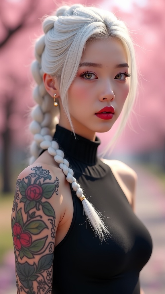 View this AI-generated image featuring a hyperrealistic portrait of a captivating korean k pop idol with a sleek white braided ponytail and vibrant red lips she sports a full sleeve tattoo and wears a form fitting all black sleeveless bodysuit the setting is a stunning cherry blossom landscape captu