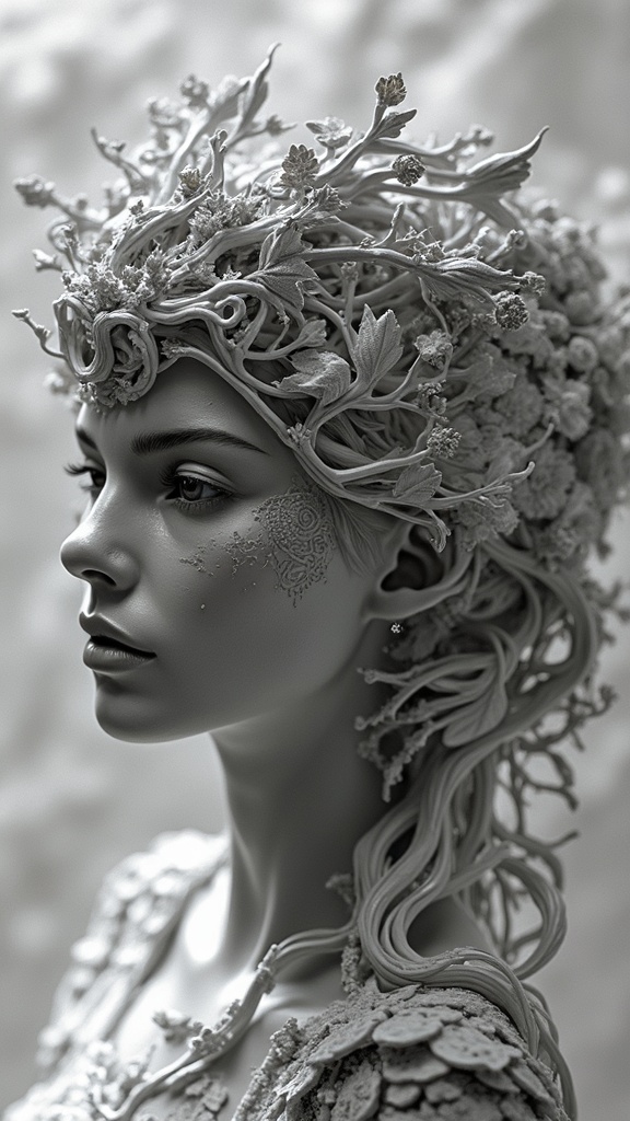 View this AI-generated image featuring a hyper realistic sci fi black and white sculpture of a woman with an intricate futuristic crown adorned with flowing organic elements and detailed nature motifs showcasing delicate vines and smooth metallic textures blending seamlessly crafted with exceptional