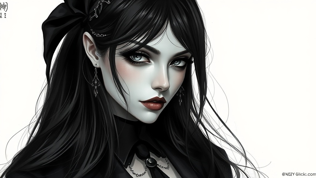 A striking portrait of a woman adorned in a sleek black and white ensemble, exuding the essence of a sophisticated and fashionable dark witch. Her gaze is intense and mysterious, echoing classic gothic horror vibes. The artwork captures intricate details in the style of WLOP, Guweiz, and Loish, with delicate brushstrokes and a subtle play of light and shadow. Her long, flowing hair cascades like a waterfall of midnight, and her enigmatic aura is enhanced by meticulously crafted accessories that meld seamlessly with her attire. The portrayal combines the elegance of a gothic girl with the enigmatic allure of a dark witch, creating a visually captivating and timeless image.