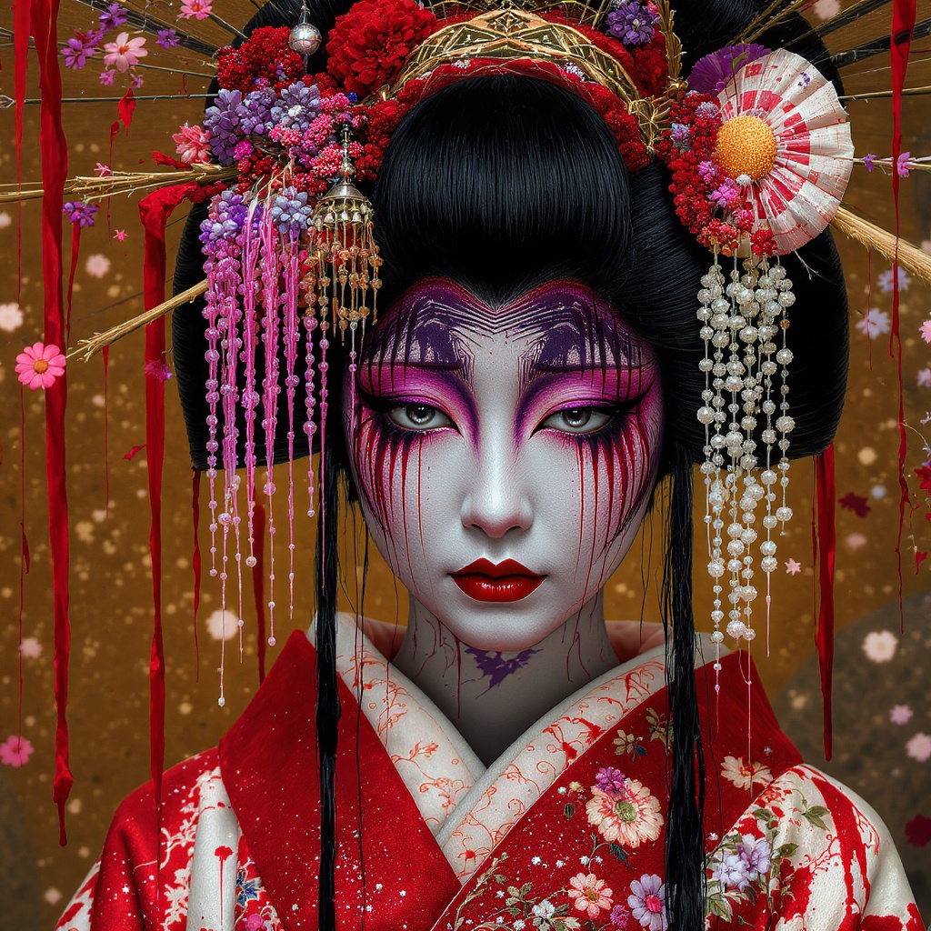 View this AI-generated image featuring portrait of a japanese black haired geisha with a melancholic expression featuring dripping vibrant colors in a detailed and elegant style the image is hypermaximalist and highly detailed with super resolution and megapixel quality creating an epic and hyper re