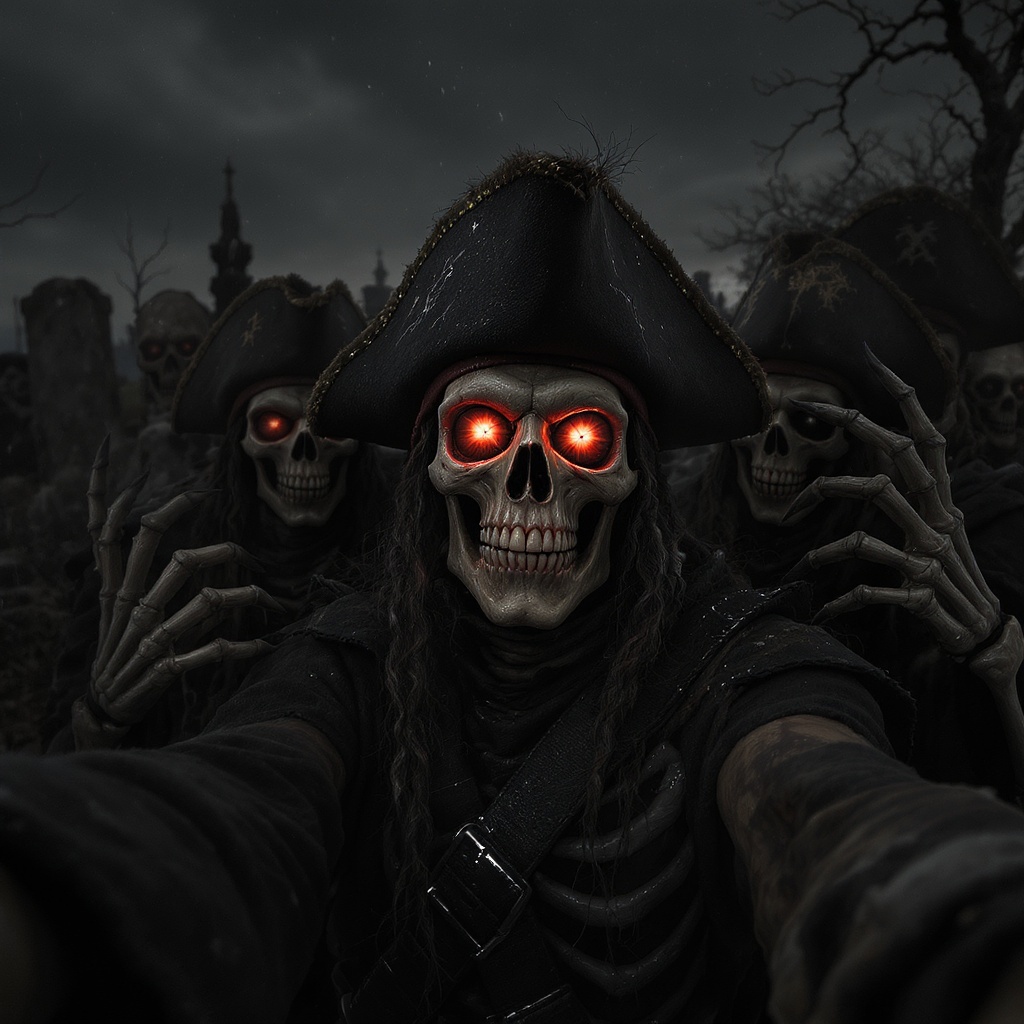 View this AI-generated image featuring a dramatic cinematic scene unfolds in an eerie graveyard where a group of skeletons and pirates gather for a chilling selfie the atmosphere is intense and vivid with extreme detail capturing the scary dark ambiance the unsettling vibe is enhanced by elements li