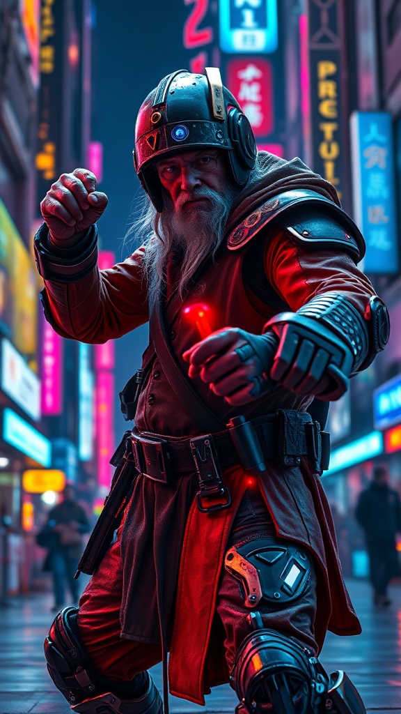View this AI-generated image featuring elderly warrior in futuristic cyber battle attire striking an action filled pose full body view against a backdrop of vibrant neon city lights glowing in the dark ultra realistic and intricately detailed capturing the essence of an 8k high definition photograph